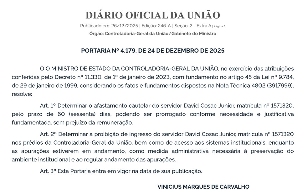 Nesta sexta-feira (26), foi publicado no Diário Oficial da União o afastamento cautelar do servidor por 60 dias. A medida inclui a proibição de acesso às dependências da CGU enquanto durarem as apurações administrativas e policiais.
